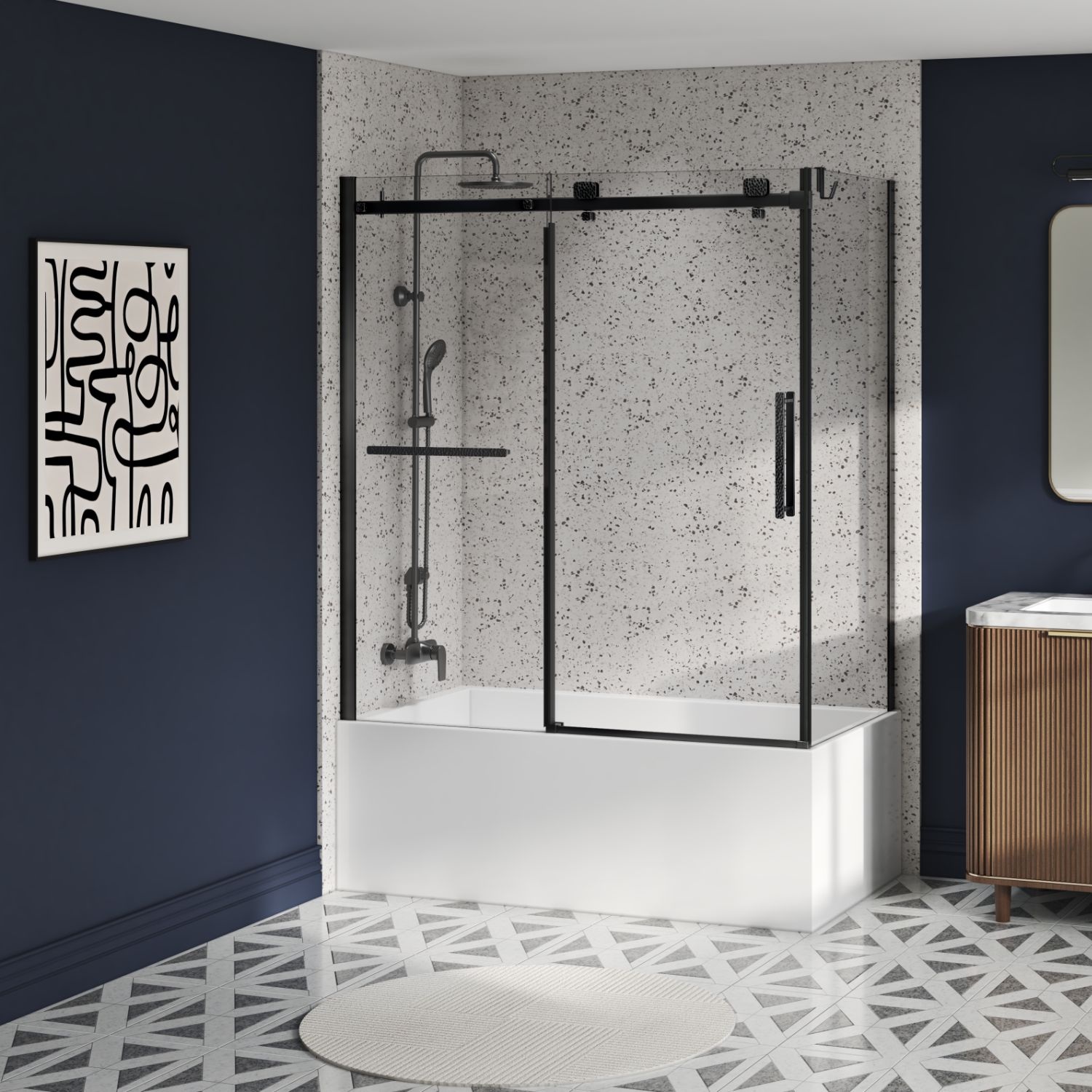 Bathtub door 60" x 32", in a corner closing on return, wall on the left, door on the right, in matte black
